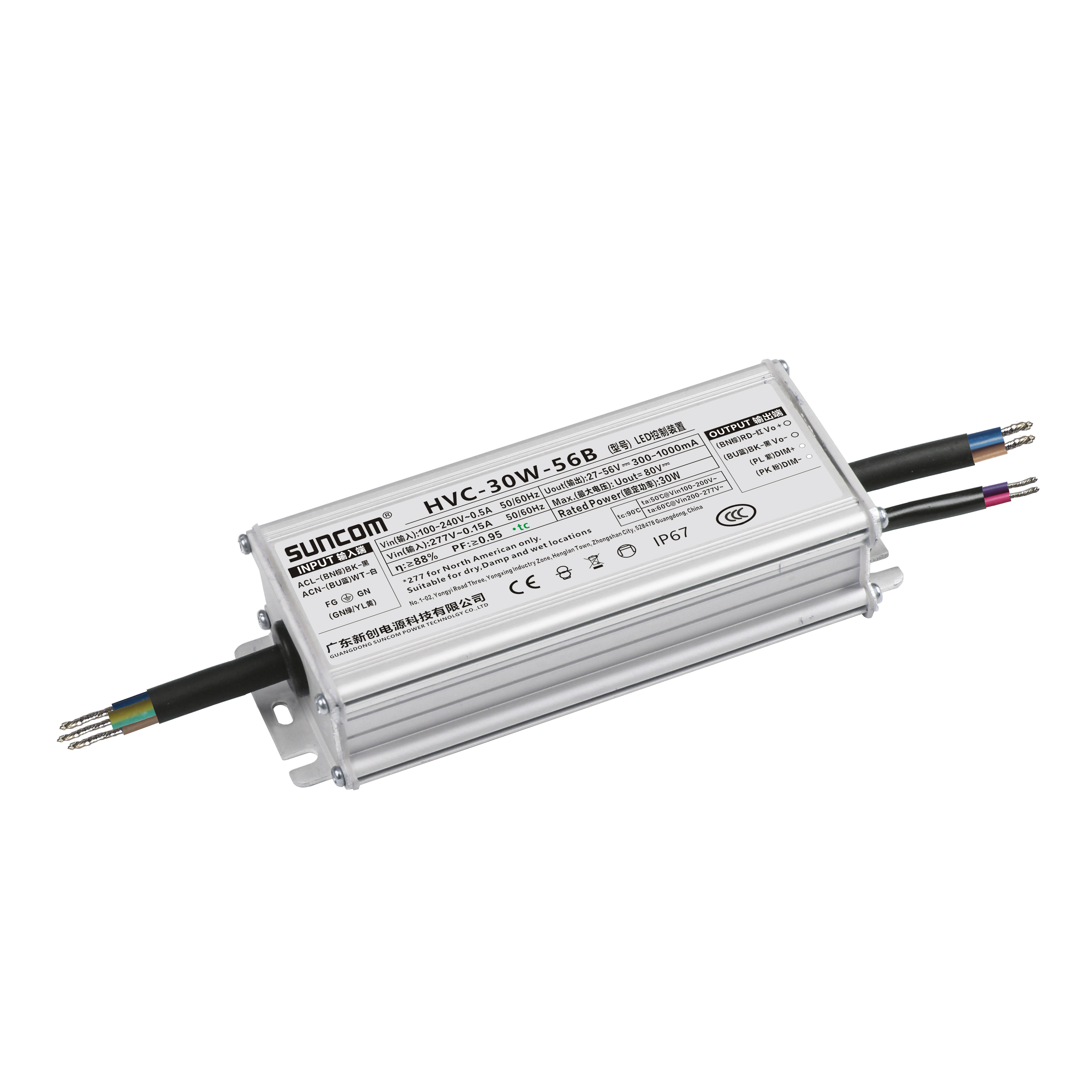 | HVC-30W-56A | 30W | 100-277V | 27-56V | 300-1000mA | 132*52*28mm | <10% | >0.95 |