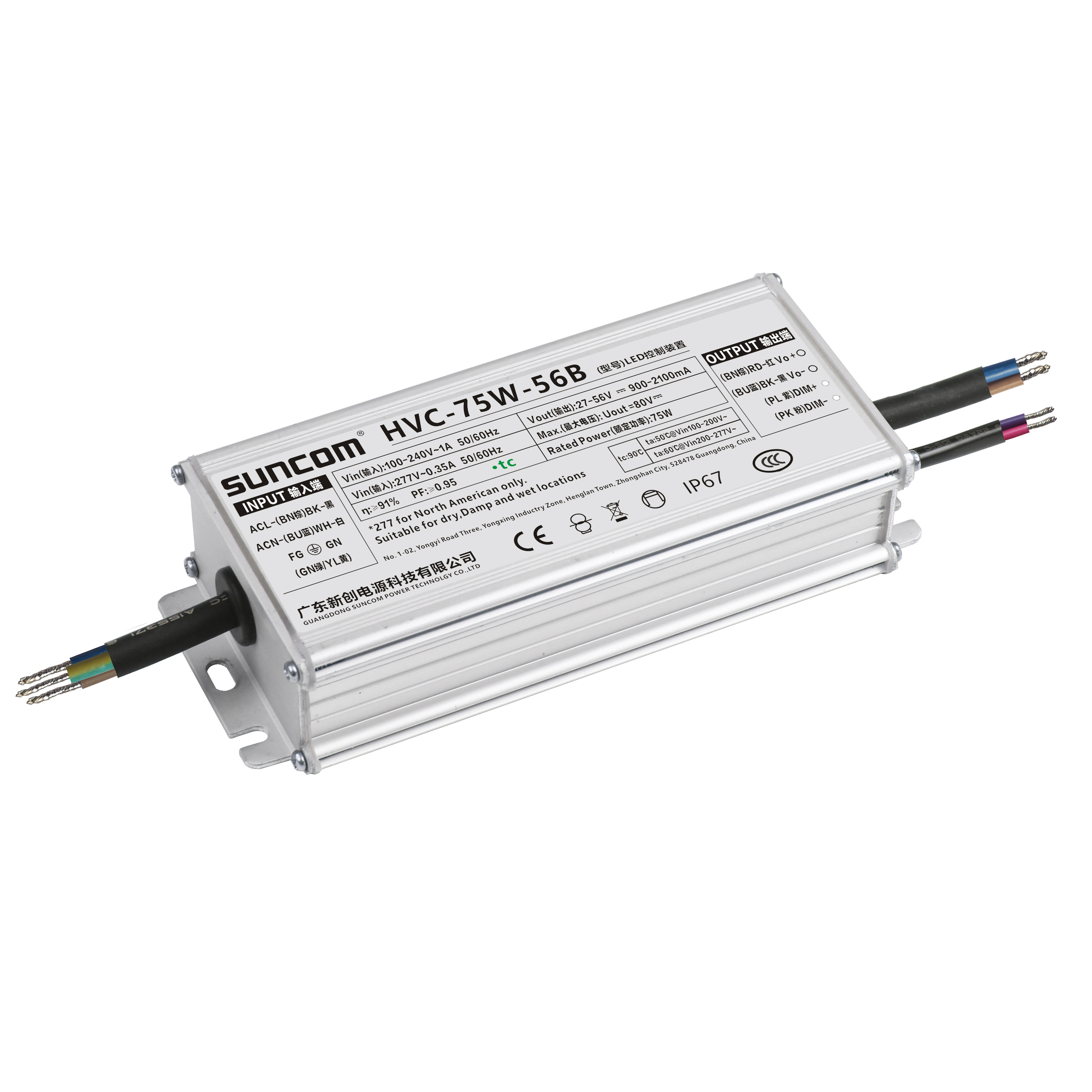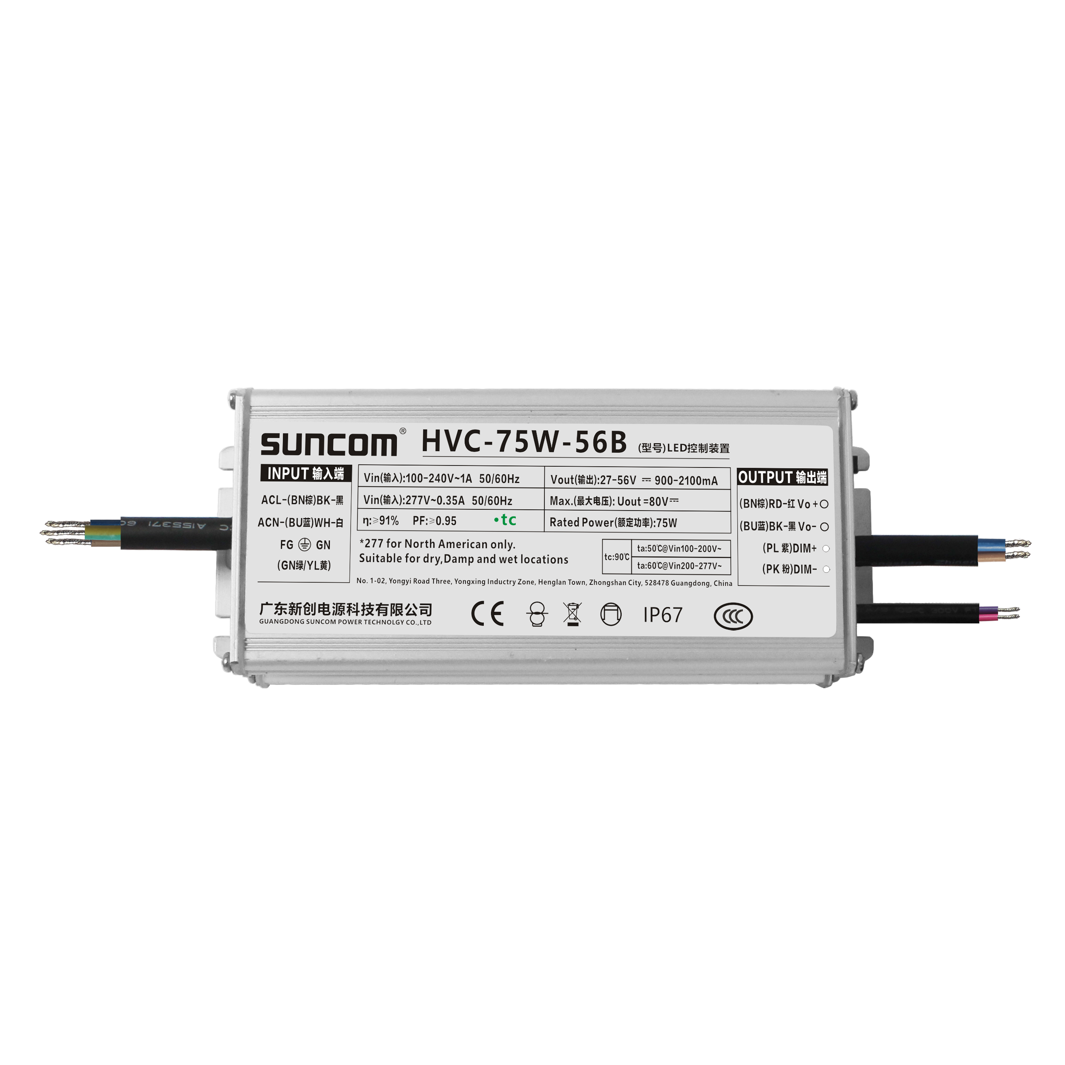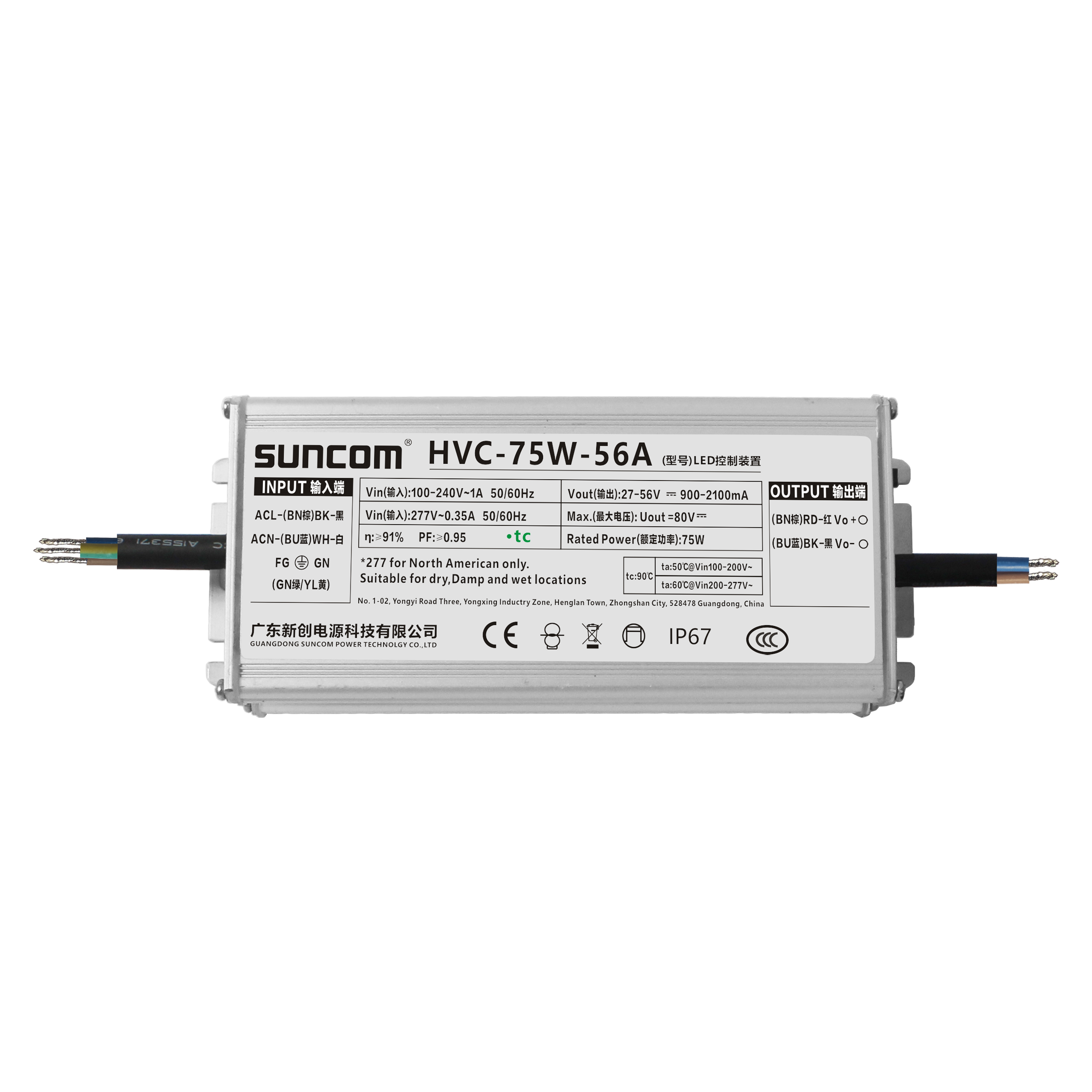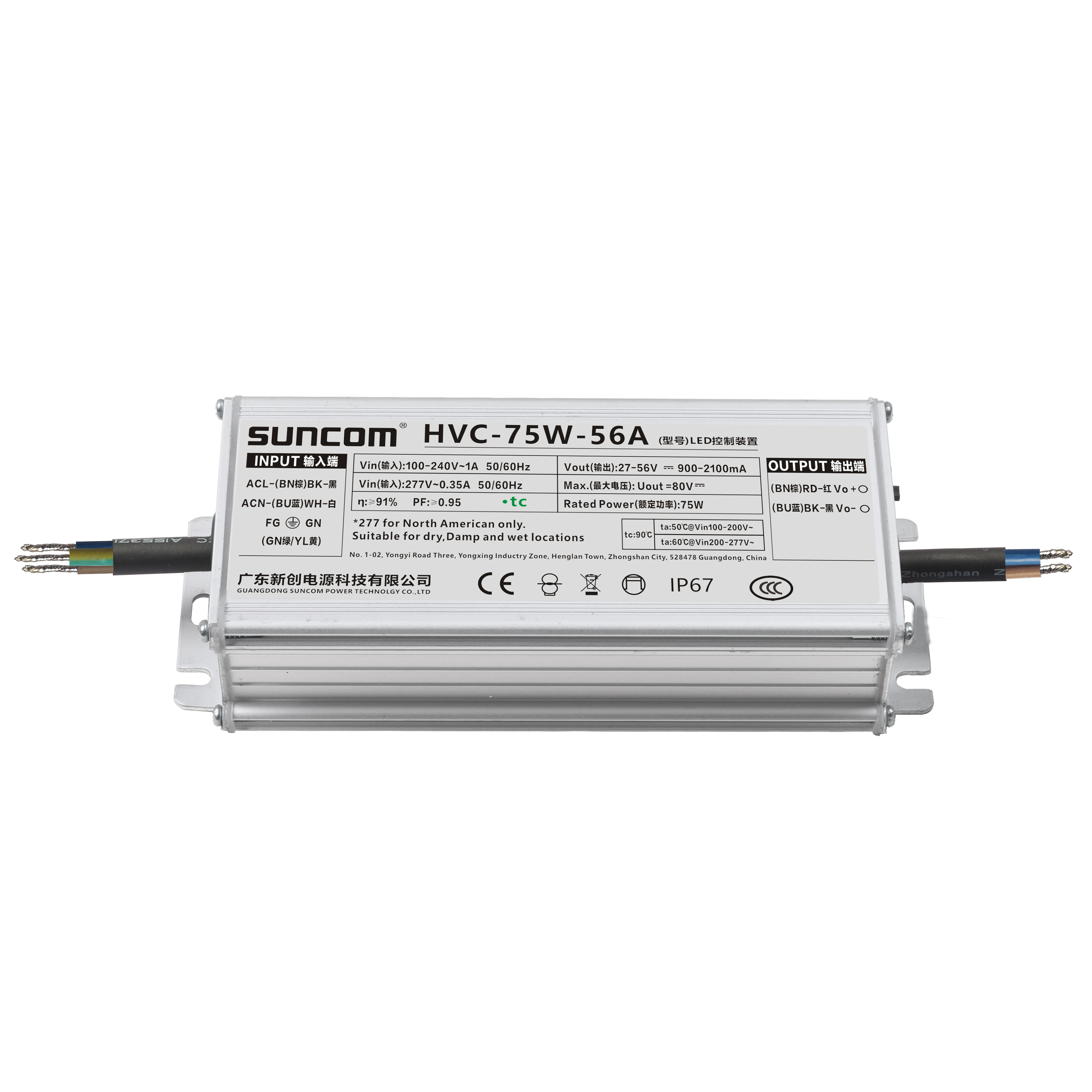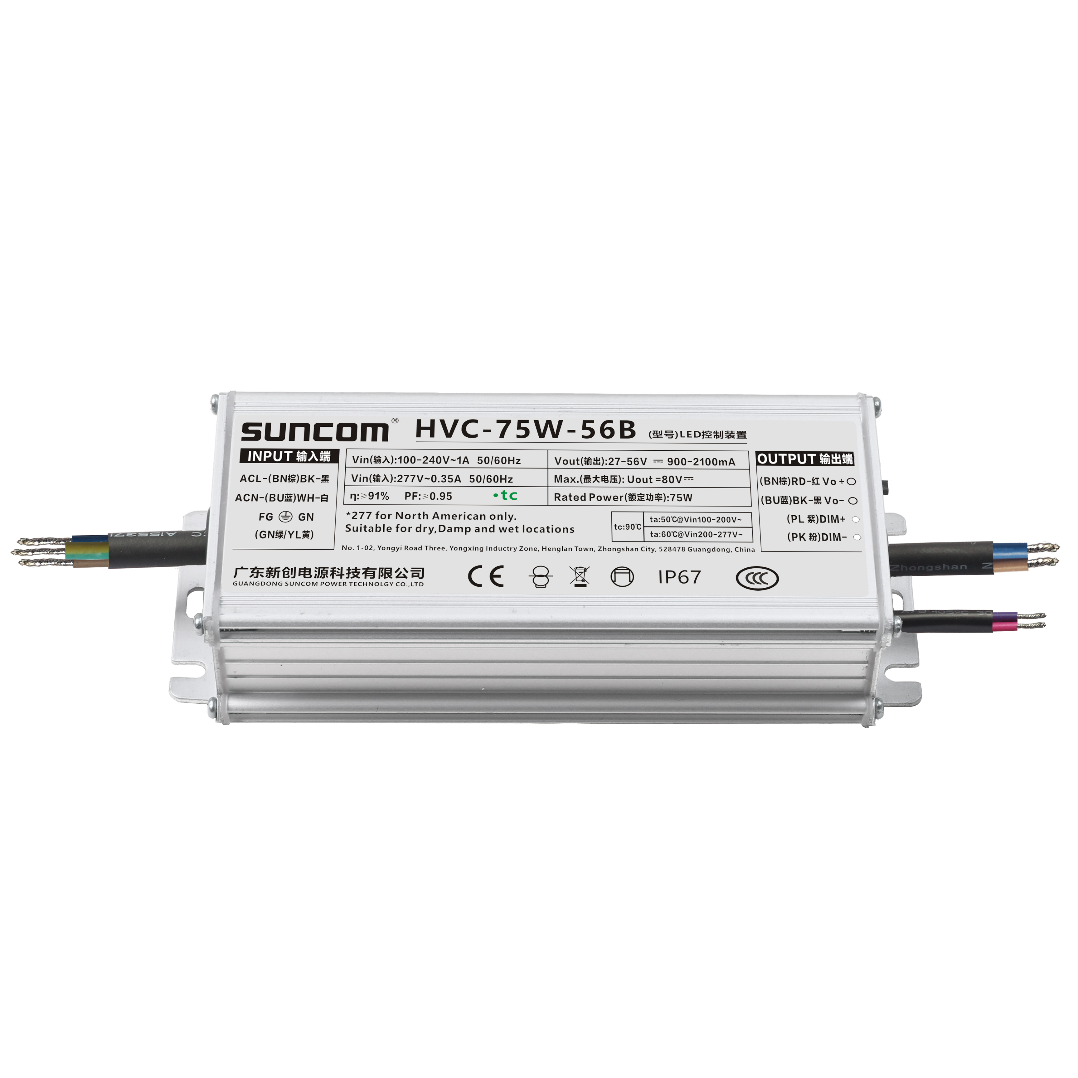 | HVC-75W-56A | 75W | 100-277V | 27-56V | 900-2100mA | 149*61*33mm | <10% | >0.95 |